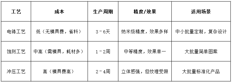 表面粗糙度可達(dá)納米級(jí),圖形邊緣光滑無(wú)毛刺,支持復(fù)雜效果(立體凸字、鏡面、拉絲紋、十字紋等)。