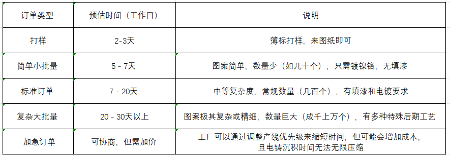 假設(shè)是一個中等復(fù)雜度的鎳鉻材質(zhì)標(biāo)牌訂單,其標(biāo)準(zhǔn)流程和時間估算如下:
